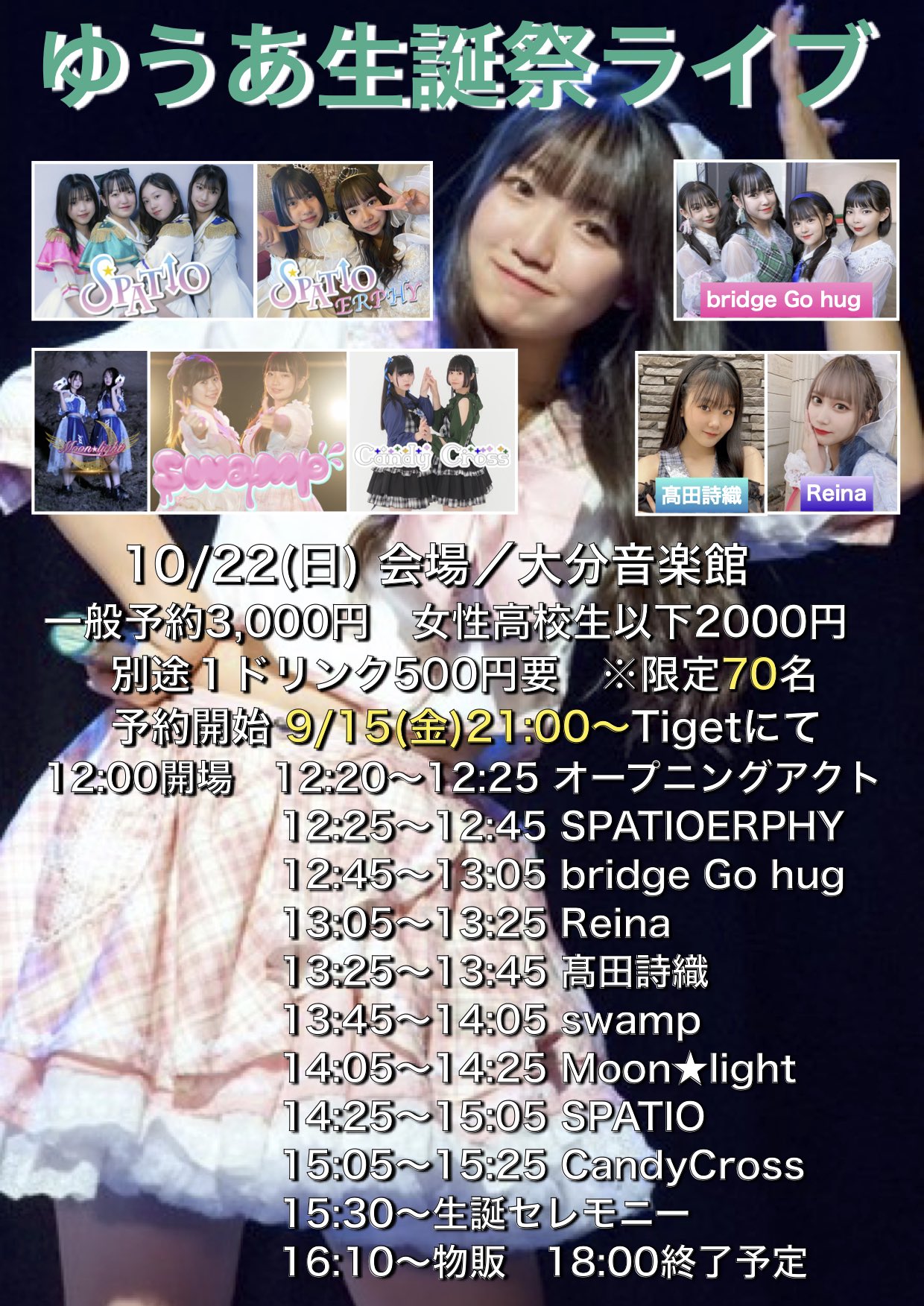《出演》SPATIO ERPHYSPATIObridge Go hugReina高田詩織swampMoonlightCandy Cross《料金》一般予約 ¥3,000+1drink¥500女性、高校生以下 ¥2,000 +1drink¥500