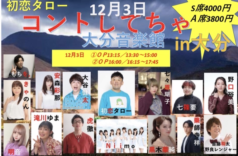 ○1部13:15OPEN13:30~15:00○2部16:00OPEN16:15~17:45S席\4,000A席\3,800<出演>初恋タロー、大谷健太、もちを。、七々原瑚子、安森あや那、きゃのん、Niimo、野口裕美、藥師寺祥、明音、りりぃ、虎徹、七篠要、黒木華純、首藤将太(野良レンジャー)