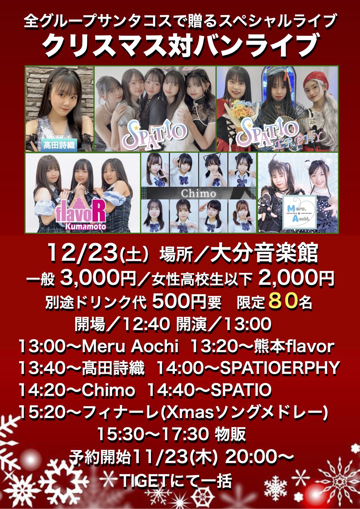 <出演>Meru Aochi熊本flavor高田詩織SPATIOERPHYChimoSPATIO《料金》一般予約 ¥3,000+1drink¥500女性、高校生以下 ¥2,000 +1drink¥500
