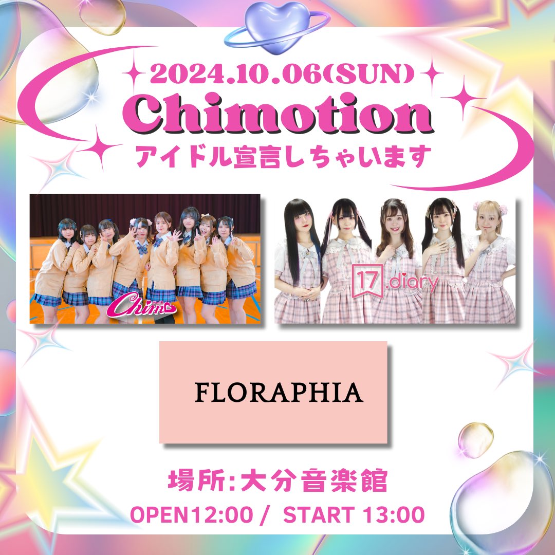 <時間>開場12:30 開演13:00<料金>[各+1ドリンク\600]前売 2000円(Drink別) 当日 2500円(Drink別)女性 1,000円(Drink別) 高校生以下500円(Drink別)<出演グループ>Chimo 17.diary Floraphia
